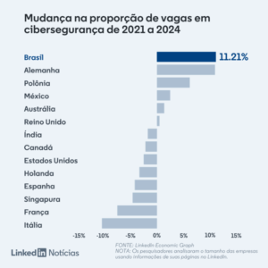 De acordo com o relatório publicado este mês pelo Boletim Tech do LinkedIn Notícias e o Economic Graph, foi realizada uma pesquisa internacional sobre o crescimento da força de trabalho no setor de cibersegurança. Esse relatório levou em consideração os meses entre maio de 2023 e 2024 e coletou dados utilizando diversos perfis do LinkedIn ao redor de todo o mundo.
